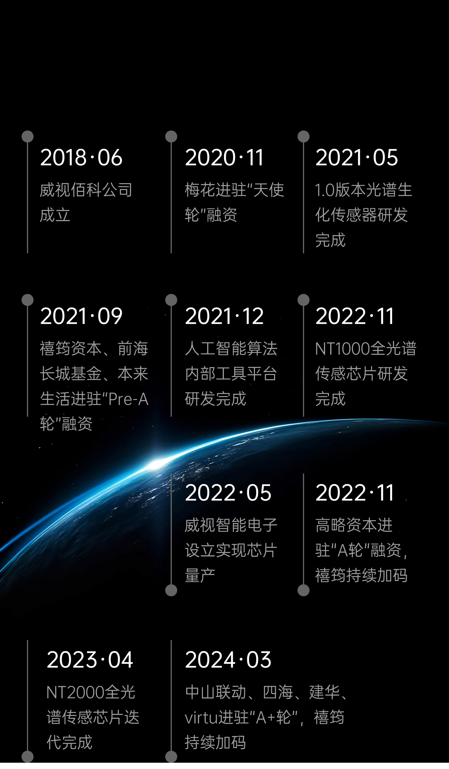 2018年,威视佰科开始探索光谱分析在行业分析领域的应用。通过多年的发光材料与芯片设计研发,威视佰科于2022年正式发布NT系列微型全光谱传感芯片,开启光谱分析向千行百业拓展的新纪元。